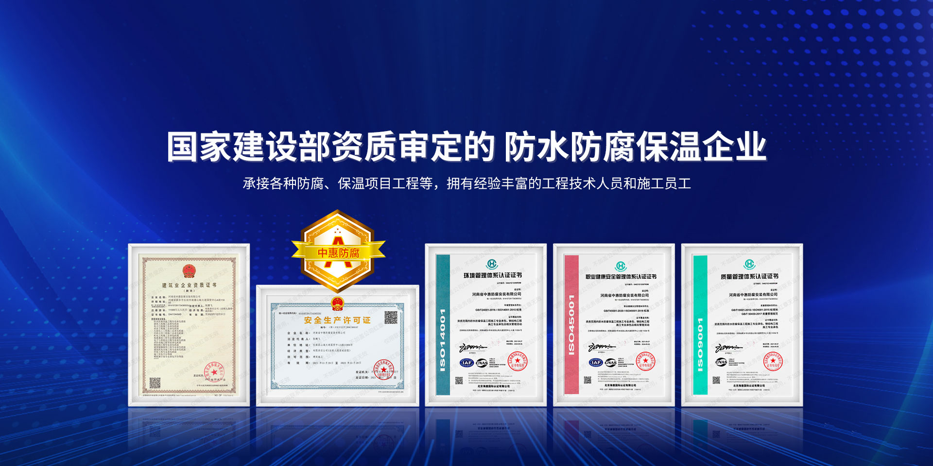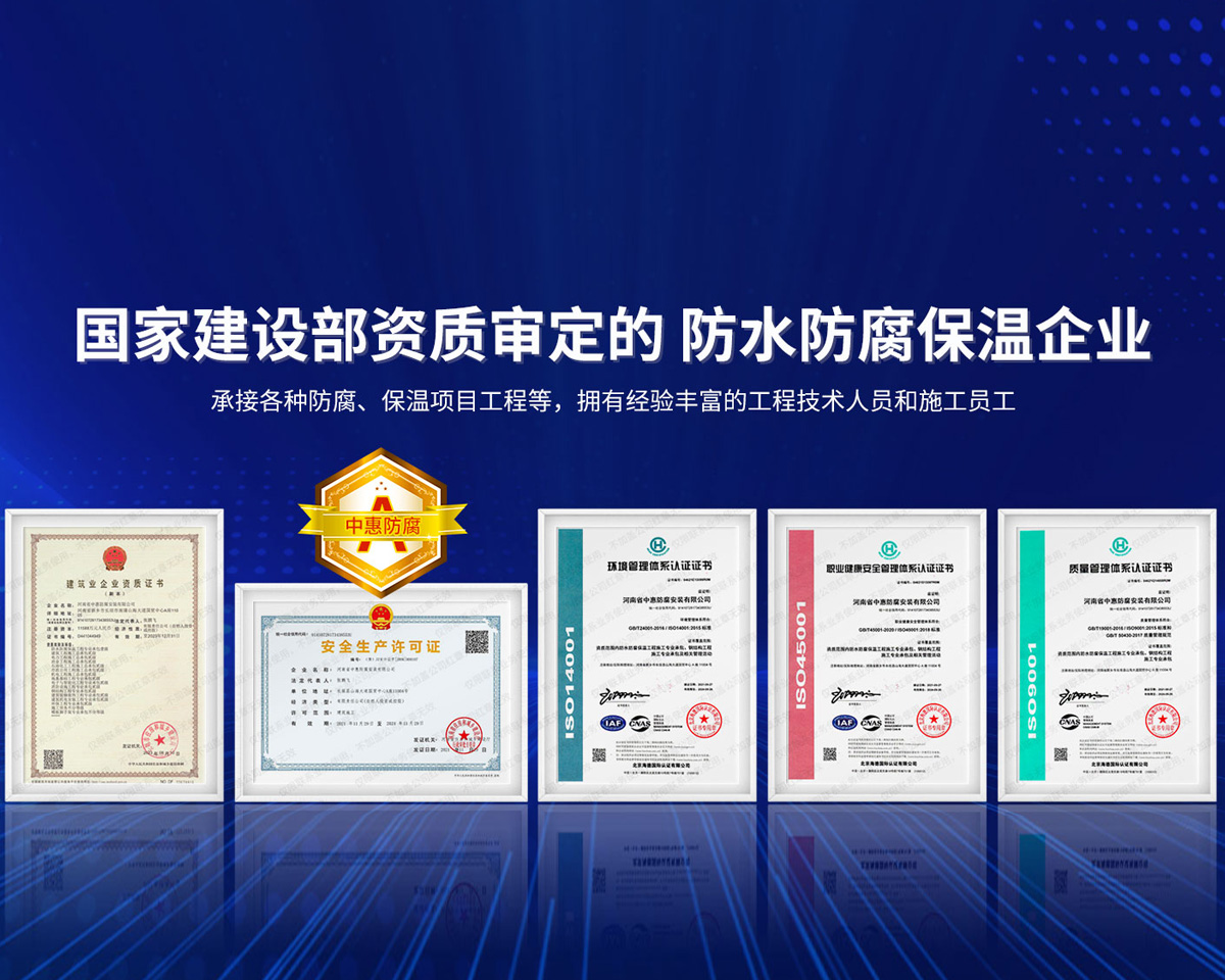 公司經營范圍:防水防腐保溫工程;消防設施工程;建筑裝修裝飾工程;建筑機電安裝工程;電力工程;建筑工程;石油化工工程;工業清洗工程;油罐清洗工程;鋼結構工程;環保工程;模板腳手架工程;電纜防火封堵、防污閃噴涂、外墻外保溫工程;各類施工勞務作業;設備維修、船舶鉚焊、涂裝;電力工程材料、建材、防水材料、防火材料、防腐保溫材料銷售,并相繼通過了GB/T19001-2008idtISO9001:2008GB/T50430-2007質量管理體系認證證書。GB/T24001-2004idtISO14001:2004環境管理體系認證證書。GB/T28001-2011idtOHSAS18001:2007職業健康安全管理體系認證證書。公司是中國防腐蝕于防護協會、中國施工企業管理協會、電力協會和中國鋼結構防水協會會員單位。 公司的經營業務涵蓋了石油、化工、電力、冶金、煤炭、船舶、國防、燃氣、水利、環保、交通運輸、航空及國防軍工和輕紡市政等行業的防腐保溫絕熱設備。鋼結構安裝、防火、防水、金屬噴鍍、聚脲噴繪、陰極保護、防滲透堵漏、玻璃鋼及各種磚版材料襯里、橡膠襯里、煙氣硫和耐酸溶劑腐蝕等工程施工。公司連續十年榮獲“省市先進施工企業”“安全生產先進單位”“重合同,守信用企業”和“AA***資質企業”的稱號。2000年被命名為市級文明單位,2002年被國家工商行政管理局命名為“重合同,守信用的企業”、被中國工業防腐蝕技術協會命名為“防腐蝕企業,能源節約及環境保護領域有豐富的經驗和***的業績。工程一次交驗合格率100%。其中攀枝花鋼鐵公司煉鐵廠四號高爐及熱風爐防腐工程、上海寶鋼公司煤氣柜防腐工程、撫順石油一廠裝置防腐項目、齊魯石化公司稀烴廠高塔防腐工程、吉林化學工業公司煉油廠油罐防腐工程、天津石化熱電廠六號爐頂棚聯絡管保溫工程、大慶油田(太倉)力神泵業工程、中國化學工程第十一建設工程、中原油田勘探局工程、中國石化銷售有限公司華北分部、魯皖輸油管道工程、貴州開磷息烽合成氨工程、陜西黃陵煤化工程、中國石油天然氣西部管道塔里木輸油工程、邯鋼集團邯寶鋼鐵公司煉鐵工程、德州供電工程、吉寶(南通)船廠工程,偃師華潤熱力工程、鄭州熱力總公司。 河南省中惠防腐安裝有限公司愿以豐富的施工經驗,***的技術,***的設備,***的管理,***的服務,竭誠為國內外廣大的用戶提供***滿意、******的工程作品。 我公司愿與國內外同仁一道,團結協作,共同推進防腐蝕行業發展! 公司地址:河南省長垣縣建設路北段360號 固定電話:0373-8866488 郵編:453400 網址:http://www_zhff_com_cn.tianxz.com